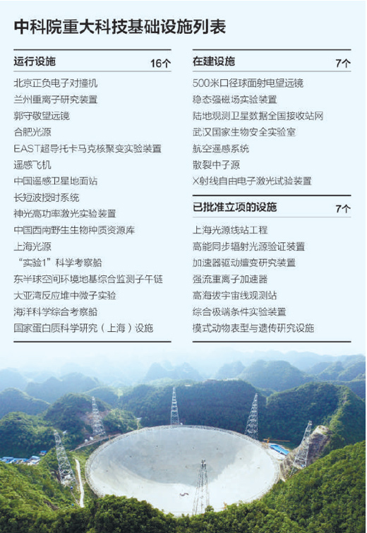 這只是中科院目前運(yùn)行和在建的23個(gè)重大科技基礎(chǔ)設(shè)施的其中之一。作為承擔(dān)我國(guó)重大科技基礎(chǔ)設(shè)施建設(shè)和運(yùn)行的主要力量,中科院負(fù)責(zé)的項(xiàng)目涉及時(shí)間標(biāo)準(zhǔn)發(fā)布、遙感、粒子物理與核物理、天文、同步輻射、地質(zhì)、海洋、能源和國(guó)家安全等眾多領(lǐng)域,其中有的是為特定學(xué)科領(lǐng)域的重大科學(xué)技術(shù)目標(biāo)建設(shè)的專用研究設(shè)施,如北京正負(fù)電子對(duì)撞機(jī)等;有的則是為多學(xué)科領(lǐng)域的基礎(chǔ)研究、應(yīng)用基礎(chǔ)研究和應(yīng)用研究服務(wù)的,具有強(qiáng)大支持能力的公共實(shí)驗(yàn)設(shè)施,如合肥同步輻射裝置等;還有的是為國(guó)家經(jīng)濟(jì)建設(shè)、國(guó)家安全和社會(huì)發(fā)展提供基礎(chǔ)數(shù)據(jù)的公益科技設(shè)施,如中國(guó)遙感衛(wèi)星地面站、長(zhǎng)短波授時(shí)系統(tǒng)等。