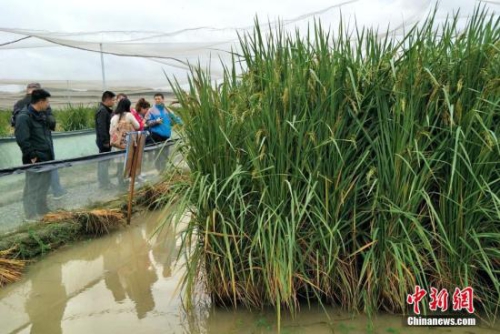 中國科學院亞熱帶農業(yè)生態(tài)研究所10月16日在長沙對外宣布,該所研究員夏新界領銜的水稻育種團隊歷經(jīng)十余年,選育出植株高1.8米到2.25米的超高產(chǎn)優(yōu)質新種質“巨型稻”。圖為人與雜交稻高度對比。中新社記者 徐志雄 攝