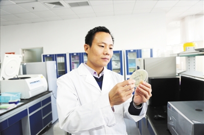2017年12月30日,孫周通在實(shí)驗(yàn)室查看生物酶培養(yǎng)結(jié)果。受訪者供圖