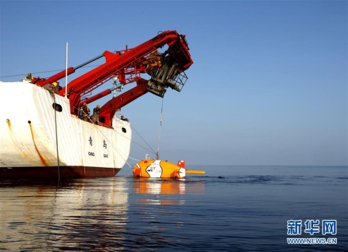 4月24日,科考隊員在布放“潛龍三號”,從母船將其放入水中。新華社記者劉詩平攝