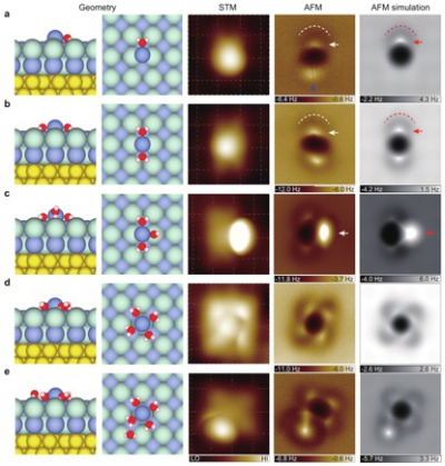 鈉離子水合物的亞分子級分辨成像。從左至右,依次為五種離子水合物的原子結(jié)構(gòu)圖、掃描隧道顯微鏡圖、原子力顯微鏡圖和原子力成像模擬圖。圖像尺寸:1.5 nm ×1.5 nm。