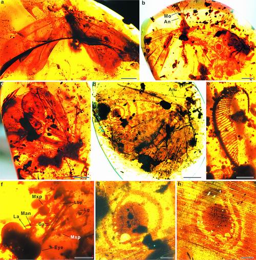 此次發(fā)現(xiàn)的麗蛉來自于白堊紀中期(一億多年前)的緬甸琥珀和中國早白堊世熱河生物群及侏羅紀的燕遼生物群。研究表明,緬甸琥珀中不同種類的昆蟲口器長度具有較高分異度??谄鏖L度高度多樣化反映了其取食植物和花管長度的多樣性,表明傳粉昆蟲的生態(tài)位分化在被子植物快速演化之前已經(jīng)出現(xiàn)。伴隨著傳粉形式的多樣化,麗蛉也演化出了獨特的化學(xué)通信和防御機制。