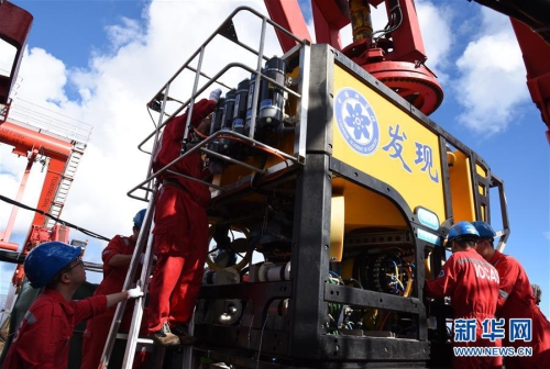 “發(fā)現(xiàn)”號(hào)遙控?zé)o人潛水器準(zhǔn)備入水(5月27日攝)。新華社記者 張旭東 攝