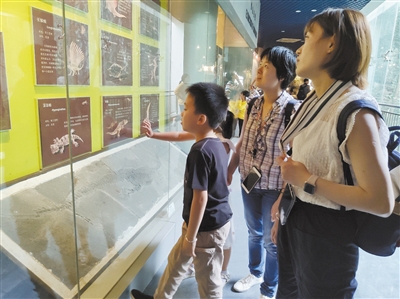 在南京古生物博物館仔細觀看展覽的孩子和家長們 雷浩然攝