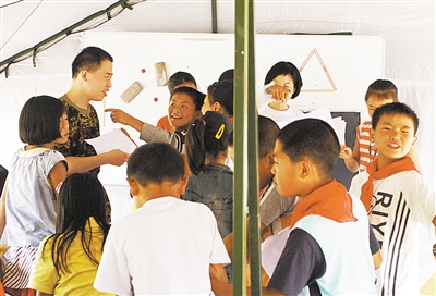 2008年6月,吳坎坎(左二)在四川綿竹災區(qū)開展輔導活動。