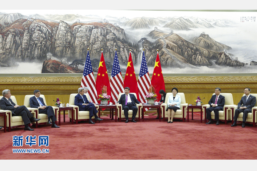 國家主席習(xí)近平7日在人民大會堂會見來華出席第八輪中美戰(zhàn)略與經(jīng)濟對話和第七輪中美人文交流高層磋商的美國國務(wù)卿克里、財政部長雅各布·盧。