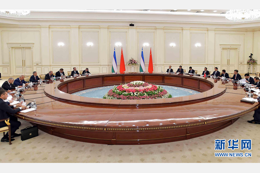 6月22日,國(guó)家主席習(xí)近平在塔什干庫(kù)克薩萊國(guó)賓館同烏茲別克斯坦總統(tǒng)卡里莫夫舉行會(huì)談。新華社記者饒愛(ài)民攝