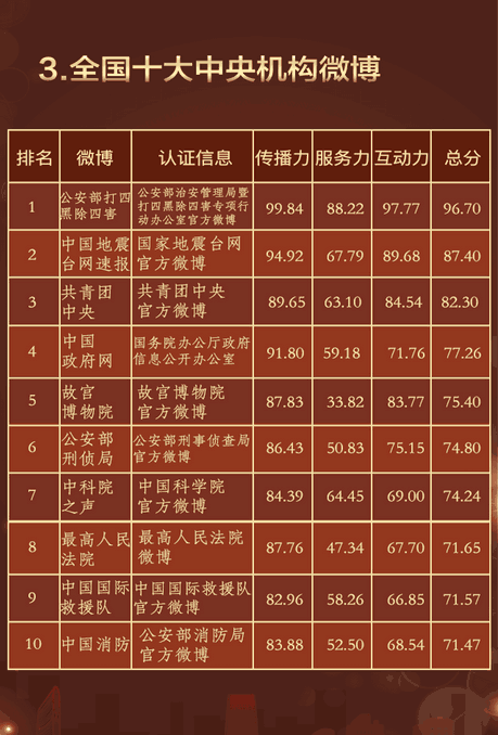 此次共有14家中央機(jī)構(gòu)微博入圍“2015年政務(wù)微博影響力百強(qiáng)榜”?!?015政務(wù)指數(shù)微博影響力報(bào)告》指出:“它們以穩(wěn)定、均衡、高效的表現(xiàn)受到廣泛認(rèn)可。它們緊跟熱點(diǎn)話題親民互動(dòng),充分利用平臺(tái)優(yōu)勢,及時(shí)回應(yīng)網(wǎng)民關(guān)切,對政務(wù)微博的發(fā)展起到了積極的示范作用,一定程度上帶動(dòng)了政務(wù)微博整體發(fā)展。”