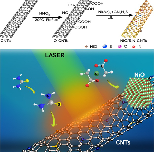 圖1. 液相激光輻照合成NiO/S,N-CNTs的示意圖。