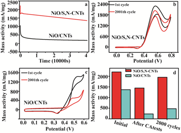 圖2. NiO/S,N-CNTs的電化學(xué)催化甲醇氧化性能。