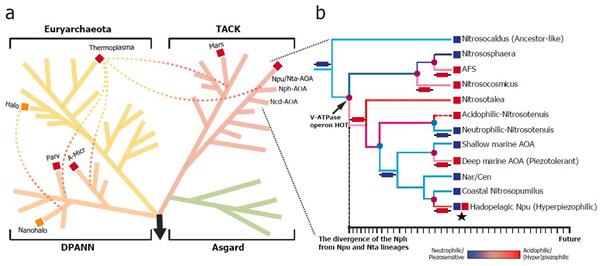 同時發(fā)現(xiàn),所有淺海AOA僅含A-型ATPase,而深海AOA均含V-型ATPase,純培養(yǎng)研究則表明A-型ATPase不具有耐壓功能;進一步分析四個超級門208個古菌物種分布的基因組規(guī)律(TACK、DPANN、Asgard和Euryarchaeota),發(fā)現(xiàn)系統(tǒng)發(fā)育單支源底部的Thermoplasmatales 廣古菌ATPase基因簇兩側(cè)含有橫向基因側(cè)移的特征轉(zhuǎn)移酶和內(nèi)切酶,在大約7~11億年前,極可能將V-型ATPase基因水平轉(zhuǎn)移至古菌AOA,導(dǎo)致其獲得耐高壓的生理功能。此外,也發(fā)現(xiàn)V型ATPase可能是古菌嗜鹽厭氧的重要基礎(chǔ),為重構(gòu)古菌生理的地球演化歷史提供了新思路。