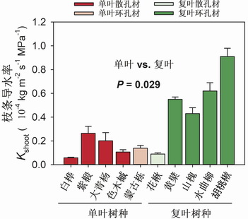 圖1. 該研究中測(cè)定的5個(gè)單葉和5個(gè)復(fù)葉樹(shù)種的枝條導(dǎo)水率