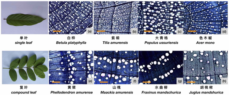 通過(guò)進(jìn)一步對(duì)我國(guó)北方常見(jiàn)的復(fù)葉喬木樹(shù)種統(tǒng)計(jì)分析,研究人員發(fā)現(xiàn)復(fù)葉樹(shù)種絕大多數(shù)具有環(huán)孔材(圖2)。依據(jù)樹(shù)木生理生態(tài)學(xué)理論,他們推測(cè)復(fù)葉樹(shù)種由于每年脫落整個(gè)復(fù)葉葉柄,額外丟失較多的碳水化合物,使得具有較低導(dǎo)水效率和較低潛在光合碳同化能力的散孔材樹(shù)種難以收回復(fù)葉脫落帶來(lái)的額外碳投入成本,因而具有復(fù)葉和散孔材的樹(shù)種絕大多數(shù)在進(jìn)化上被淘汰,而保留下來(lái)的環(huán)孔材復(fù)葉樹(shù)種通常具有較高的生產(chǎn)力。但是,環(huán)孔材樹(shù)種對(duì)于凍融造成的枝條木質(zhì)部氣穴化栓塞非常敏感,這也使得多數(shù)溫帶復(fù)葉樹(shù)種(如東北“三大硬闊”)主要分布于海拔相對(duì)較低的環(huán)境中。