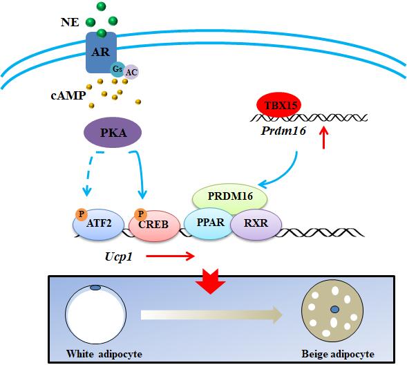 肥胖及其相關(guān)代謝疾病包括Ⅱ型糖尿病、心血管疾病和癌癥等嚴(yán)重威脅人類健康。肥胖的發(fā)生主要由能量失衡導(dǎo)致,因此提高機(jī)體能量消耗能夠有效抑制肥胖發(fā)生。哺乳動(dòng)物體內(nèi)的褐色脂肪細(xì)胞和米色脂肪細(xì)胞中特異性高表達(dá)解偶聯(lián)蛋白1(UCP1),可以將能量轉(zhuǎn)化為熱量,從而促進(jìn)能耗。通過(guò)激活褐色脂肪細(xì)胞產(chǎn)熱及促進(jìn)米色脂肪細(xì)胞生成,進(jìn)而提高機(jī)體能耗,已成為治療肥胖及代謝相關(guān)疾病的研究熱點(diǎn)。