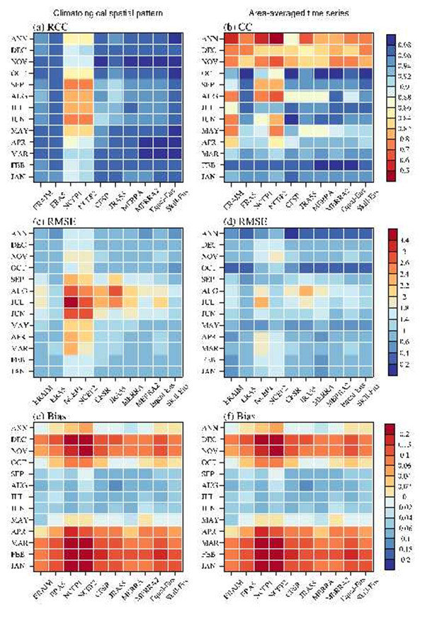 圖:再分析資料評(píng)估結(jié)果。再分析資料相對(duì)AIRS/AMSU的(a,b)相關(guān)系數(shù),(c,d)均方根誤差和(e,f)相對(duì)偏差。(a,c,e)為區(qū)域平均時(shí)間序列結(jié)果,(b,d,f)為氣候態(tài)空間分布結(jié)果。每一行表示某一月或年平均,每一列表示某一套再分析資料或算術(shù)平均值、技巧權(quán)重均值。