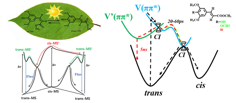 十字花科植物的葉片表面均勻分布著一層反式構型的蘋果酸芥子酯類似物,可以將具有破壞性的紫外線能量,在幾十個皮秒內(nèi)通過光致順反異構轉化為無毒無害的熱能,同時生成大量順式產(chǎn)物(JPCL,2017)。生成的大量順式產(chǎn)物在防曬分子整體的防曬效果中也有著重要的作用,然而順式產(chǎn)物在吸收紫外線后的光物理和光化學過程卻不清楚。有鑒于此,該研究團隊以最小的芥子酸酯methyl sinapate (MS)為模型,通過飛秒瞬態(tài)吸收光譜技術和含時密度泛函等多種理論方法,首次研究了順式MS的光動力學行為。研究人員發(fā)現(xiàn)順式結構在激發(fā)態(tài)時,一部分分子會通過與反式結構類似的過程通過非絕熱馳豫的方式回到基態(tài),但是另一部分激發(fā)態(tài)分子會經(jīng)過絕熱馳豫的方式生成反式結構的激發(fā)態(tài)分子,然后再通過非絕熱的方式回到基態(tài)。對順式構型的研究進一步加深了人們對植物防曬分子的機理及光致異構化動力學的認識,相關工作發(fā)表在《物理化學快報》(The Journal of Physical Chemistry Letters)上。
