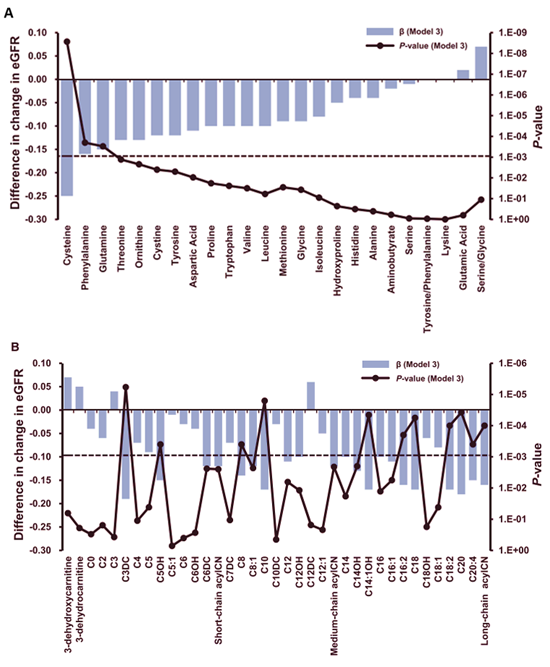 圖1 氨基酸譜(A)和酰基肉堿譜(B)與6年前后腎功能(eGFR)改變的關(guān)聯(lián)關(guān)系