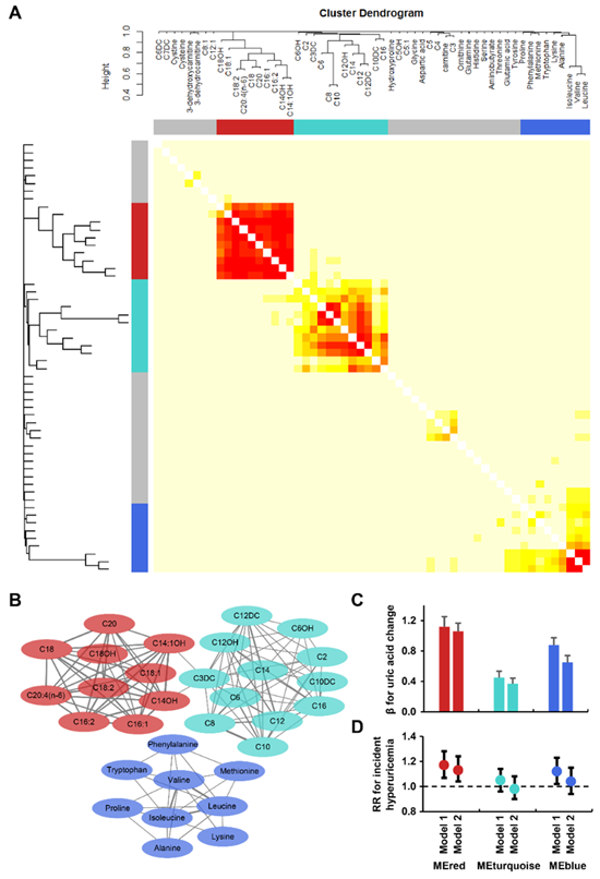 圖2 氨基酸和?;鈮A譜的網(wǎng)絡(luò)分析:(A)網(wǎng)絡(luò)分析熱圖;(B)三個代謝物網(wǎng)絡(luò)模塊示意圖;(C)代謝物模塊與6年前后尿酸改變關(guān)系;(D)代謝物模塊與6年新發(fā)高尿酸血癥關(guān)聯(lián)關(guān)系