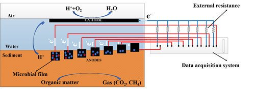 近年來,微生物電化學技術迅速發(fā)展,微生物燃料電池逐漸成為一種全新的生物傳感方法。同時,沉積物微生物電化學技術是至今能夠突破理論,實現(xiàn)具體應用的微生物電化學技術。沉積物微生物電化學技術構造簡單,其陽極埋在還原性的沉積物中,陰極置放在空氣-水界面,陰陽極之間的外電路接入負載。其作用機理為:在陽極區(qū)的有機質(zhì)被產(chǎn)電微生物氧化分解利用,產(chǎn)生的電子到陽極,再經(jīng)過外電路到達陰極形成電流,質(zhì)子則通過水溶液傳遞到陰極,并與氧氣反應生成水。