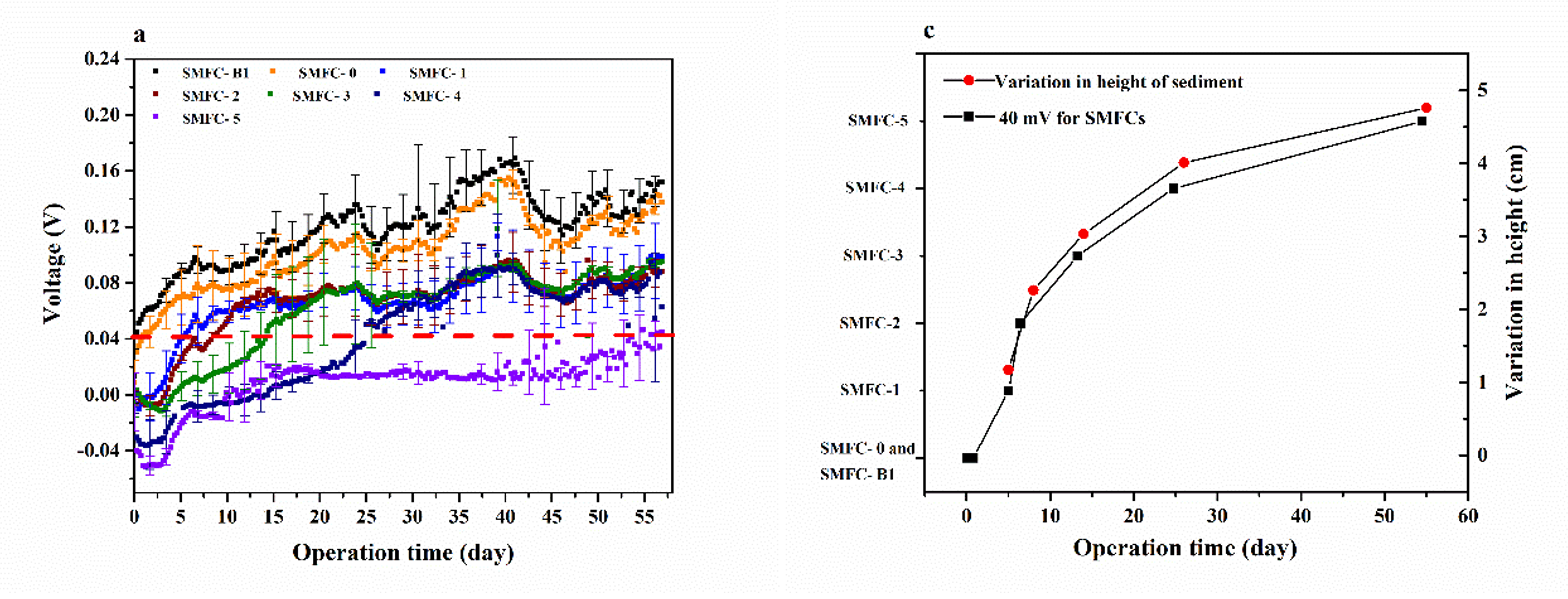 根據(jù)沉積物微生物電化學陽極和陰極上反應機理,中國科學院南京地理與湖泊研究所江和龍團隊博士王春柳設計了一種運行互不干擾的垂直分布的多陽極微生物電化學組新結構(圖1),利用沉積物高程變化會影響到微生物電化學工藝的電信號輸出的原理,可以實時監(jiān)測沉積物在1cm 尺度上的高度變化(圖2)。研發(fā)的裝置儀器能夠只用一臺儀器即可實現(xiàn)對沉積物高程變化的在線監(jiān)測,維護成本低且運行穩(wěn)定,目前已通過室內(nèi)實驗優(yōu)化了傳感器裝置的主要影響參數(shù)。此成果已授權發(fā)明專利(專利號201820703903.x),并以Real-time monitoring of sediment bulking through a multi-anode sediment microbial fuel cell as reliable biosensor 為題發(fā)表在Science of the total environment 期刊上。