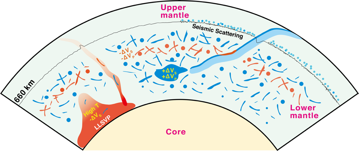 了解地球的物質(zhì)組成對(duì)理解地球起源、演化與動(dòng)力學(xué)過程至關(guān)重要。地球內(nèi)部圈層可大致分為地殼、上地幔、下地幔和地核。下地幔是地球內(nèi)部最重要的圈層之一,深度范圍約為660-2900公里,其體積和質(zhì)量占比高達(dá)55%和52%,是地球演化的壓艙石。雖然很難獲得來自下地幔的樣品,但是地震波具有穿透整個(gè)地球的能力,從而提供了地球深內(nèi)部結(jié)構(gòu)探測(cè)的關(guān)鍵手段。近年來,隨著地震波觀測(cè)、分析與模擬技術(shù)的發(fā)展,地震學(xué)者發(fā)現(xiàn)在下地幔存在許多尺度不一的異常體,包括大尺度(幾百至上千公里)的高速和低速異常體和小尺度(幾公里)的散射體。尤為著名的低速異常體是位于非洲和太平洋板塊底下的大型低剪切波速?。?/span>LLSVPs),其橫向和徑向尺度可達(dá)上千公里。這些異常體的成因?qū)斫獾厍騼?nèi)部結(jié)構(gòu)與物質(zhì)組成起著關(guān)鍵的作用,對(duì)制約地球起源和動(dòng)力學(xué)演化亦為重要,是地球科學(xué)研究的熱點(diǎn)與前沿問題。