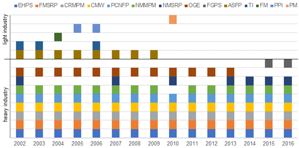 圖1. 2002到2016年新疆工業(yè)領(lǐng)域CO2排放重點(diǎn)行業(yè)演變趨勢(shì)