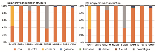 圖2. 2016年新疆工業(yè)CO2能源消費(fèi)結(jié)構(gòu)和能源行業(yè)碳排放結(jié)構(gòu)對(duì)比