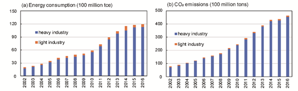 圖3. 新疆重工業(yè)、輕工業(yè)能源消費(fèi)和CO2排放量