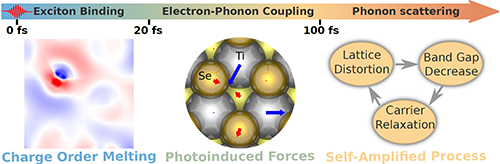 最近,中國科學(xué)院物理研究所/北京凝聚態(tài)物理國家研究中心表面物理國家重點(diǎn)實驗室SF10組的廉超(現(xiàn)為德州大學(xué)奧斯汀分校博士后)在研究員孟勝的指導(dǎo)下,利用數(shù)年時間,持續(xù)編寫和測試了完全自主研發(fā)的含時密度泛函軟件包TDAP,解決了一系列物理問題、效率問題和數(shù)值穩(wěn)定性問題,將其發(fā)展為高效、穩(wěn)定、精確的含時密度泛函模擬工具。利用這一軟件包,在孟勝的指導(dǎo)下,廉超與張圣杰、關(guān)夢雪、胡史奇合作,對激光激發(fā)二硒化鈦的超快動力學(xué)進(jìn)行了同時具有超快時間分辨和原子精度空間分辨的第一性原理計算,發(fā)現(xiàn)了其電荷密度波形成的激子-聲子的自放大機(jī)制(圖1),為電荷密度波研究提供了新的思路。相關(guān)成果近日發(fā)表在《自然-通訊》(Nature Communications 11,43(2020))上。