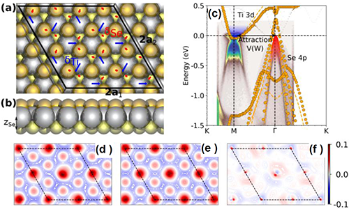 圖2. 二硒化鈦中的電荷序。(a)和(b)為原子結(jié)構(gòu)圖,箭頭展示周期晶格畸變的大小和方向。(c)為電荷序形成前的能帶圖(背景為實驗數(shù)據(jù)),展示激子吸引效應(yīng)。(d-f)顯示光激發(fā)導(dǎo)致的電荷密度變化。(d)圖和(e)圖分別為考慮和不考慮晶格畸變的情況,(f)為兩者之差。紅色為得電子,藍(lán)色為失電子。