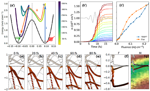 圖3. 二硒化鈦中的離子勢能(a’)和能帶(a-g)的含時演化。(b‘)為不同激光強(qiáng)度下的載流子數(shù)隨時間的變化,(c’)為最大載流子數(shù)與激光強(qiáng)度的關(guān)系(方塊:實驗數(shù)據(jù);圓點(diǎn):理論結(jié)果)。