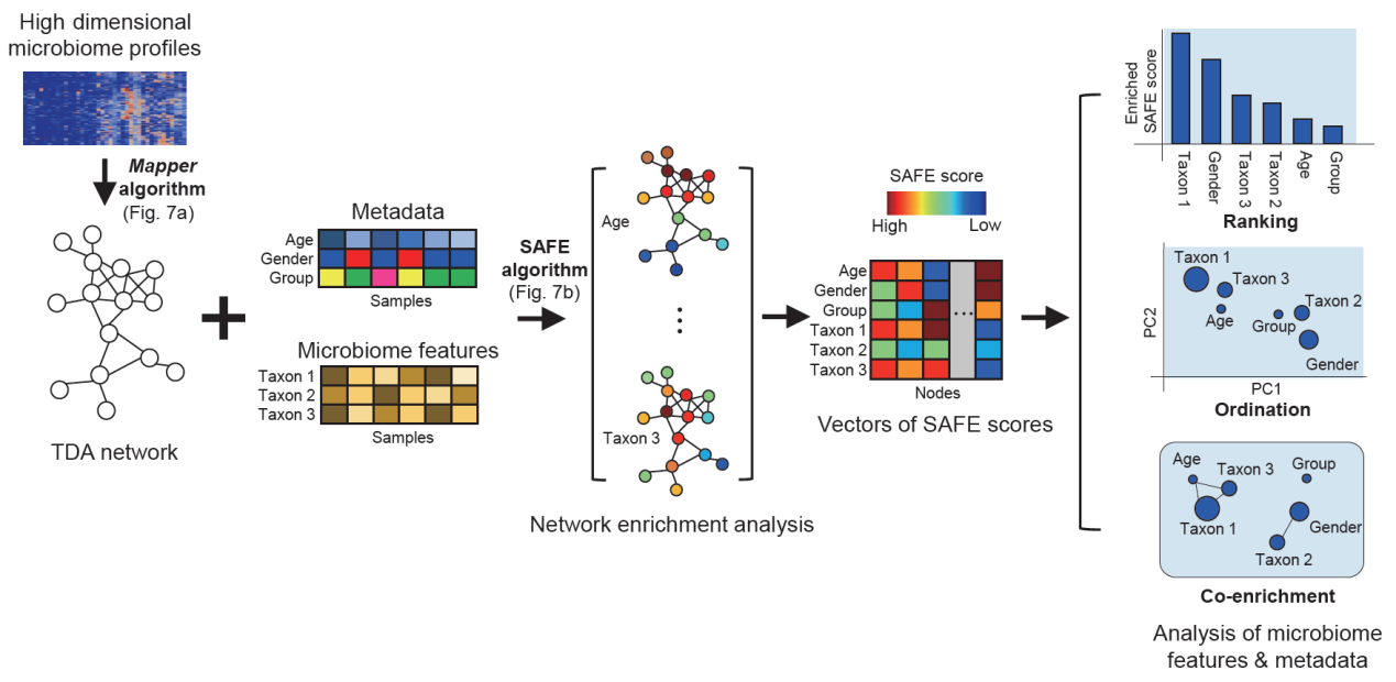 本課題組結(jié)合mapper算法和網(wǎng)絡(luò)富集分析,開發(fā)基于拓?fù)鋵W(xué)數(shù)據(jù)分析(topological data analysis, TDA)的tmap軟件,提供了整合大規(guī)模人群微生物組數(shù)據(jù)的分析框架。tmap將不同國(guó)家地區(qū)、不同疾病類型和不同宿主表型的人群微生物組大數(shù)據(jù)加以整合,融合不同來源的微生物組及其宿主表型的醫(yī)療健康大數(shù)據(jù),是目前微生物組數(shù)據(jù)共享和整合的創(chuàng)新性方法。這對(duì)大規(guī)模人群隊(duì)列的數(shù)據(jù)分析而言,不僅歸納總結(jié)了數(shù)據(jù)隱含的規(guī)律,也對(duì)科學(xué)假設(shè)的提出,科學(xué)問題的提煉有很大幫助。