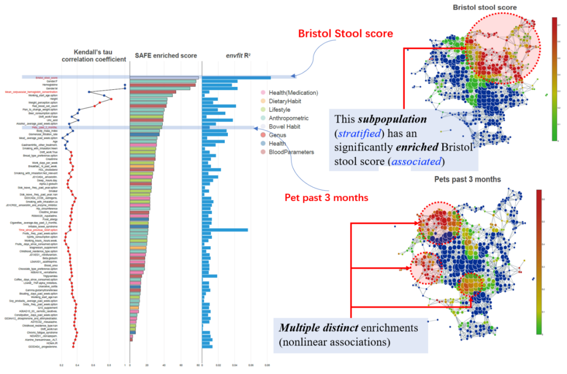 以比利時(shí)隊(duì)列為例,對(duì)疾病和用藥的共富集分析。左圖為關(guān)聯(lián)微生物組特征與宿主表型,對(duì)宿主表型進(jìn)行排序。并與傳統(tǒng)envfit方法比較。右圖表現(xiàn)了tmap對(duì)線性及非線性關(guān)聯(lián)均有良好的捕捉。