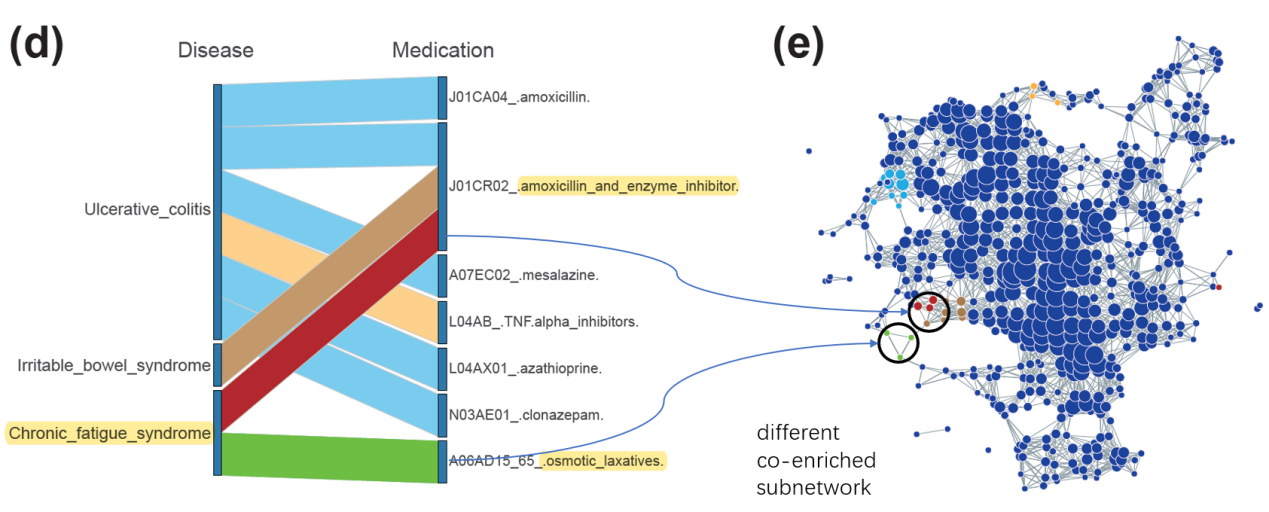 另外,本研究通過對(duì)4個(gè)數(shù)據(jù)集(包括1個(gè)合成數(shù)據(jù)和3個(gè)真實(shí)世界數(shù)據(jù))對(duì)tmap方法加以驗(yàn)證,結(jié)果表明與傳統(tǒng)的線性方法(如envfit, adonis, ADONISM)相比,tmap都表現(xiàn)更好,對(duì)非線性關(guān)聯(lián)及潛在規(guī)律都有較好的識(shí)別。以比利時(shí)隊(duì)列FGFP為例:2016年發(fā)表在Science,研究?jī)?nèi)容為健康正常人群的腸道微生物組。研究納入了1106個(gè)糞便16S rRNA樣本,及樣本的69個(gè)宿主表型特征,包括了7個(gè)metadata類別:社會(huì)人口學(xué)特征,生活方式,血液指標(biāo),健康狀況,飲食習(xí)慣,腸道健康狀況及病史用藥情況。文章表明,僅有7.63%的微生物組改變與宿主表型的變化有關(guān)。tmap提高了識(shí)別并解讀population-scale的微生物組-宿主表型關(guān)聯(lián)的能力。如下圖所示,tmap不僅可以較好地復(fù)現(xiàn)envfit這種基于線性回歸的方法,也在對(duì)非線性變化的捕捉上,比envfit更加靈敏。通過對(duì)FGFP數(shù)據(jù)轉(zhuǎn)化的SAFE score分析,可以得到許多原始文章中沒有挖掘到的規(guī)律和線索。如下圖所示,比如兩種藥物雖然與同一種疾病相關(guān)聯(lián),但其對(duì)微生物組的影響是不同的,具體表現(xiàn)為在網(wǎng)絡(luò)圖上的富集部位不一樣。這都是傳統(tǒng)線性分析難以得到的。
