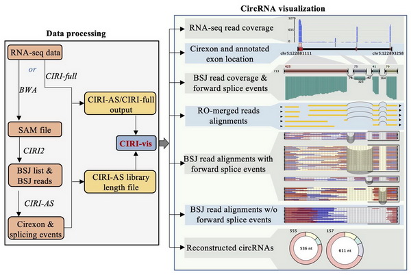 1月18日,中國科學(xué)院北京生命科學(xué)研究院趙方慶團(tuán)隊(duì)于Bioinformatics 雜志上在線刊發(fā)了題為Visualization of circular RNAs and their internal splicing events from transcriptomic data 的研究。該研究主要開發(fā)了環(huán)形RNA的可視化工具——CIRI-vis軟件,具有將CIRI-AS或CIRI-Full的輸出結(jié)果可視化,且可以批量展示環(huán)形RNA上的讀段信息與內(nèi)部結(jié)構(gòu)的優(yōu)勢。