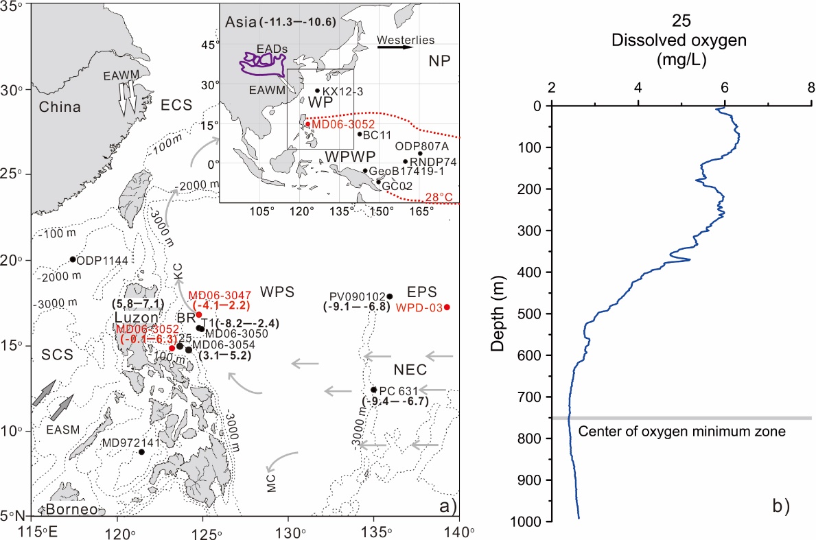 作為全球海洋系統(tǒng)的重要組成部分,西太平洋暖池為大氣提供了諸多的熱量和水汽,進而通過厄爾尼諾-南方濤動等機制影響著全球氣候變化和碳循環(huán)。然而,國內(nèi)外科研界對于第四紀(jì)階段該地區(qū)生態(tài)系統(tǒng)和生物地球化學(xué)循環(huán)過程的控制因素則存在著兩種截然不同的觀點,即厄爾尼諾-南方濤動相關(guān)的溫躍層變化和陸源物質(zhì)輸入。而造成上述爭議的最主要原因是前人的相關(guān)研究工作多聚焦于溫躍層變化顯著但陸源物質(zhì)輸入有限的西太平洋暖池中、東部地區(qū)(即遠(yuǎn)離陸地/島嶼的開闊大洋區(qū)),進而很可能低估了陸源物質(zhì)輸入的重要性。