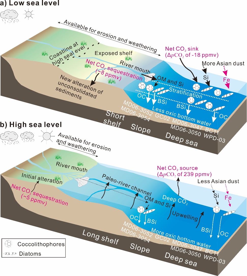 研究人員通過系統(tǒng)對比位于西太平洋暖池西部地區(qū)(黑潮源區(qū))的緯向巖芯剖面(大陸坡上的MD06-3052孔、本哈姆高原上的MD06-3047孔和深海盆地中的WPD-03孔)的水動力、陸源有機質(zhì)輸入、海表生物生產(chǎn)力及海底氧化-還原環(huán)境方面高分辨率綜合記錄,首次明確了晚第四紀(jì)冰期低海平面階段研究區(qū)增強的陸源物質(zhì)輸入對海表古生產(chǎn)力水平、海底還原環(huán)境及海底碳埋藏的積極促進作用。具體表現(xiàn)為兩種方式,以呂宋島為代表的熱帶火山島弧地區(qū)大陸架的廣泛出露及出露大陸架上松散硅酸鹽沉積物的強風(fēng)化剝蝕作用可以消耗大量的大氣二氧化碳(即“硅酸鹽風(fēng)化假說”在研究區(qū)的適用性),且其產(chǎn)物的入??梢詾榇箨懫碌群^(qū)帶來豐富的陸源有機質(zhì)和營養(yǎng)元素(如硅),進而導(dǎo)致此處的海表生物生產(chǎn)力勃發(fā)、海底還原環(huán)境及海底碳的大量埋藏;此時亞洲風(fēng)塵物質(zhì)及其所攜帶的營養(yǎng)元素(如鐵和硅)輸入量的增加也可以引起深海區(qū)類似現(xiàn)象的發(fā)生(即“鐵假說”在研究區(qū)的適用性)。
