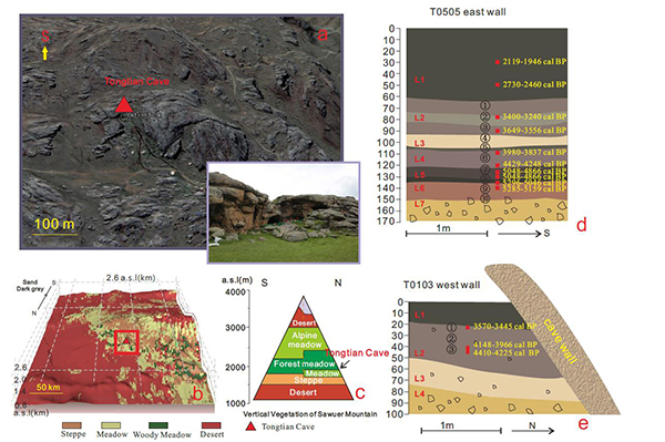 圖1. 研究點與研究區(qū)域概況,a.通天洞遺址照片;b.通天洞遺址周邊植被分布特征;c.薩烏爾山垂直植被特征;d.T0505探方地層與AMS14C年代分布,T0103探方地層與AMS14C年代分布(周新郢供圖)