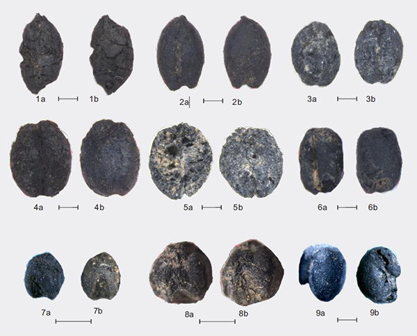 圖2. 通天洞遺址出土炭化作物。1. Hordeum vulgare var. nudum (T0505-9. 5295-5046 cal yr