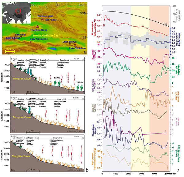 圖3. 通天洞遺址周邊植被變化及區(qū)域氣候指標對比(周新郢供圖)