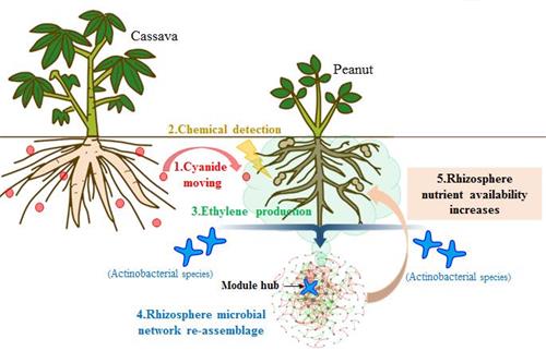 花生-木薯是南方紅壤區(qū)重要的間作系統(tǒng),針對調控花生和木薯競爭促進養(yǎng)分利用問題,中國科學院南京土壤研究所孫波課題組基于紅壤旱地花生連作、花生-木薯間作田間試驗,結合盆栽、水培實驗和外源乙烯添加實驗,利用高通量測序、激素組分析等方法,研究了種間植物(花生與木薯)地下部化學信號識別途徑,揭示了花生信號調控根際微生物的競爭性防御生存策略。研究發(fā)現鄰近植物木薯產生的氰化物可誘導間作花生根系乙烯釋放。該信號分子一方面調控花生生理應答;另一方面可經根部釋放重塑根際微生物群落,影響作物養(yǎng)分吸收。研究結果表明:花生與木薯間作,木薯根部的氰化物促進花生根部乙烯前體積累,上調乙烯相關基因表達,激發(fā)乙烯釋放。這種氣體分子以減少花生植株地上生物量為代價,調控花生根際微生物網絡中的核心物種(放線菌門Catenulispora sp.)豐度,重塑微生物網絡結構。新構建的微生物組加速根際有機氮磷礦化,為花生地下部提供可利用氮磷養(yǎng)分,從而提高花生子代有效繁殖能力,進一步提高花生在間作模式下的生態(tài)適應性。該研究揭示了種間植物競爭下植物根系與微生物間基于信號的“化學對話”機制,提出建立合作關系以改善植物生態(tài)適應性的調控原理,為在酸化貧瘠紅壤旱地上建立合理的花生-木薯間作管理措施、提高養(yǎng)分利用率和產出率提供了理論基礎。