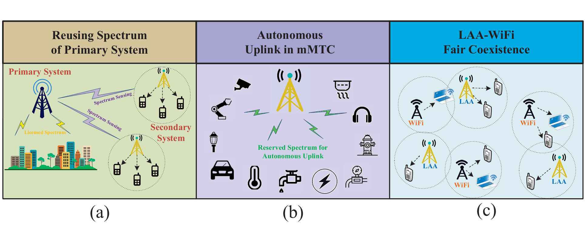 圖1. 5G生態(tài)體系中涉及智能感知的幾個典型應(yīng)用場景,分別為:(a)常規(guī)5G通信場景;(b)工業(yè)4.0及智能物聯(lián)網(wǎng)場景;(c)異構(gòu)網(wǎng)絡(luò)混合共存場景