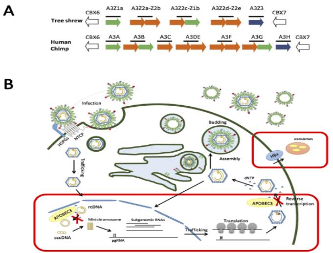 樹鼩APOBEC3的基因模式以及抗病毒圖示意圖。(A)樹鼩APOBEC3有5個(gè)家族基因;(B)樹鼩APOBEC3能夠通過基因編輯作用限制HBV的復(fù)制;HBV的X蛋白能夠促進(jìn)外泌體形成外排APOBEC3,從而降低胞內(nèi)APOBEC3的水平來(lái)促進(jìn)病毒復(fù)制。