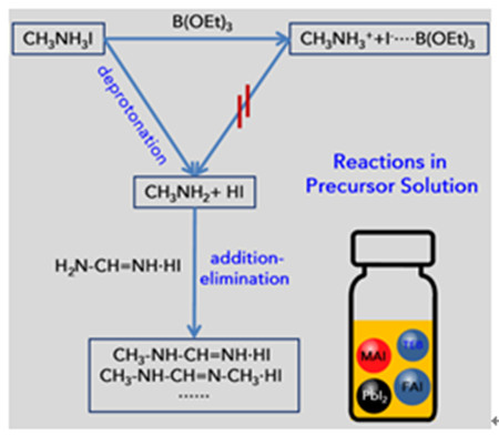 圖:利用硼酸三乙酯添加劑抑制鈣鈦礦溶液中的副反應(yīng)。