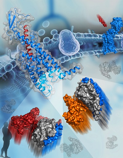 胰高血糖素受體GCGR的三維結(jié)構(gòu)示意圖。GCGR參與調(diào)節(jié)人體內(nèi)血糖穩(wěn)態(tài),是治療2型糖尿病藥物的重要靶點。圖中左上角GCGR的三維結(jié)構(gòu)以藍(lán)色飄帶圖顯示,GCGR的天然配體胰高血糖素以紅色飄帶顯示;圖下方為與GCGR結(jié)合的兩種G蛋白,以表面圖顯示,其中,Gs蛋白的三個亞基分別用橙色、灰色和藍(lán)色顯示,Gi蛋白的三個亞基分別用紅色、灰色和藍(lán)色顯示。(圖片由中科院上海藥物所吳蓓麗研究組提供)