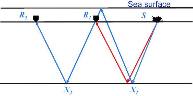 圖1 波場傳播路徑。震源S激發(fā)的地震波在R1處記錄為上行反射波和下行鬼波,在R2處記錄為上行的地下多次反射波。R1鬼波為R2多次波的二次震源,S處鬼波為干涉效應(yīng)(未標(biāo)出)