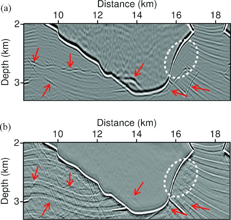 中國科學(xué)院地質(zhì)與地球物理研究所博士劉學(xué)建及其導(dǎo)師、研究員劉伊克,針對真實的野外數(shù)據(jù)采集觀測系統(tǒng),通過深入研究地震多次波的波路徑傳播過程,發(fā)現(xiàn)檢波器記錄的下行鬼波是產(chǎn)生地震多次反射波的真正二次震源(圖1)。他們提出用工業(yè)標(biāo)準(zhǔn)方法分離出檢波器位置下行鬼波,再利用逆時偏移消除一次震源的鬼波干涉效應(yīng),利用最小二乘逆時偏移反演成像方法逐步消除串?dāng)_噪聲(圖2箭頭和橢圓標(biāo)示),從而提高了成像分辨率以及地球內(nèi)部介質(zhì)的成像解釋。