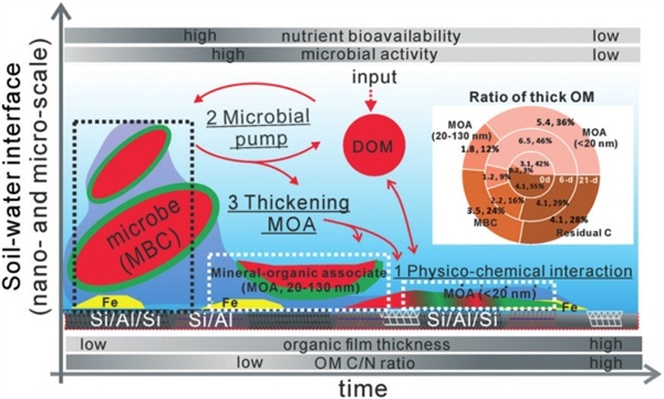 基于微界面連續(xù)觀察結(jié)果,研究人員提出土壤有機(jī)質(zhì)穩(wěn)定性的固-液耦合生物地球化學(xué)機(jī)制:微生物介導(dǎo)的有機(jī)質(zhì)轉(zhuǎn)化過程有利于有機(jī)-無(wú)機(jī)復(fù)合物多層自組裝結(jié)構(gòu)的形成;增厚的有機(jī)質(zhì)層存儲(chǔ)可利用態(tài)養(yǎng)分,屏蔽內(nèi)層有機(jī)質(zhì)的降解,限制溶液中微生物代謝,促進(jìn)有機(jī)質(zhì)的穩(wěn)定性。該機(jī)制耦合物理化學(xué)和生物學(xué)控制機(jī)制,為土壤有機(jī)質(zhì)連續(xù)體模型(Soil continuum model)提供證據(jù),對(duì)Z軸上增加土壤碳固定提出結(jié)構(gòu)性啟示。該研究成果是自土壤芯片技術(shù)(SoilChip)提出以來(lái)的第三篇原創(chuàng)性論文,土壤芯片技術(shù)為理清土壤多過程耦合的復(fù)雜生物地球化學(xué)循環(huán)提供了研究方法,未來(lái)結(jié)合同位素示蹤技術(shù)和界面表征技術(shù),可為認(rèn)知土壤其他元素或污染物的歸趨提供基于微-納尺度過程的基礎(chǔ)性知識(shí)。
