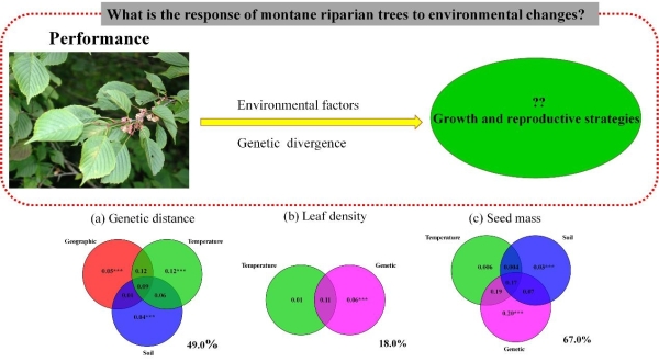 在前期研究的基礎(chǔ)上,植被生態(tài)課題組研究人員整合遺傳、性狀和環(huán)境數(shù)據(jù),探究環(huán)境梯度上領(lǐng)春木的適應(yīng)策略及潛在的機(jī)制。結(jié)果表明:(1)地理隔離和環(huán)境隔離效應(yīng)共同作用于種群間的遺傳差異,而環(huán)境隔離效應(yīng)可以解釋種群間的性狀差異;(2)低緯度地區(qū)分布的領(lǐng)春木采取資源保守生長策略(resource conservative strategy)并表現(xiàn)出較高的萌蘗能力,而高緯度地區(qū)分布的領(lǐng)春木采取資源獲取生長策略(resource acquisitive strategy)并生產(chǎn)質(zhì)量較輕的種子。中國分布區(qū)尺度上,領(lǐng)春木生長和繁殖策略是對特定環(huán)境的適應(yīng),萌蘗性狀(可塑性)是對季節(jié)性洪水的響應(yīng),而種子質(zhì)量和葉片密度差異是(局域適應(yīng))土壤和溫度因子定向選擇的結(jié)果。