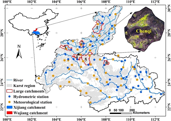 喀斯特是由具有溶蝕力的水對可溶性巖石進(jìn)行溶蝕等作用所形成的基巖裸露的石漠化景觀。由于巖溶作用,喀斯特流域的土層淺薄且分布不連續(xù),地表植被稀疏,抗干擾能力弱,屬于非地帶性的脆弱生態(tài)帶??λ固亓饔蚺c非喀斯特流域的水文過程存在較大差異??λ固亓饔虻漠a(chǎn)流、匯流過程受到地形起伏、土壤厚度的控制,并受到巖石裂隙的分布、走向、地表落水洞、漏斗和天坑等巖溶地貌的綜合影響。由降雨形成的地表水因這些復(fù)雜的地形結(jié)構(gòu)而快速向地下滲漏,導(dǎo)致喀斯特地表植物缺乏生長所需的必要水分。
